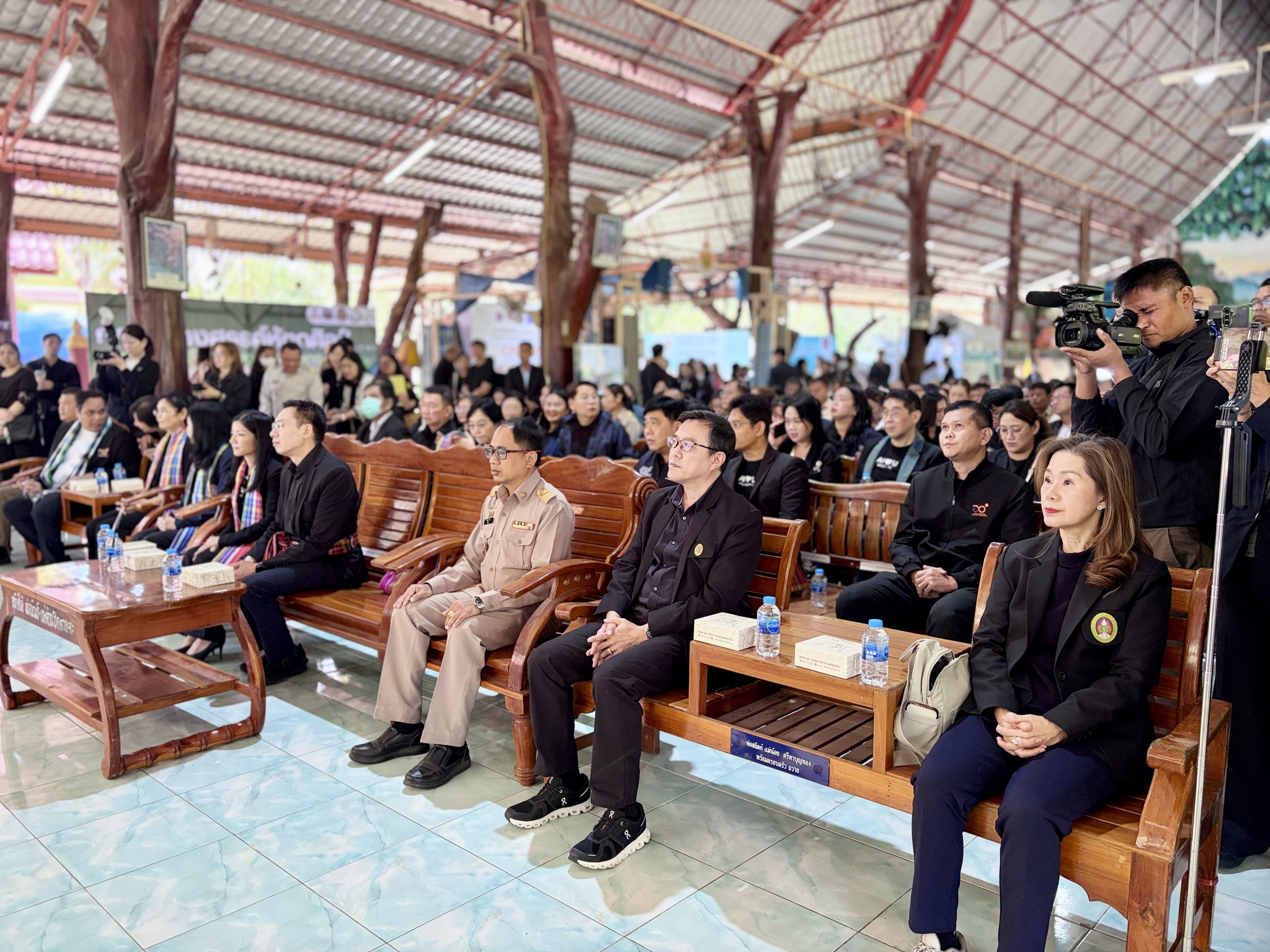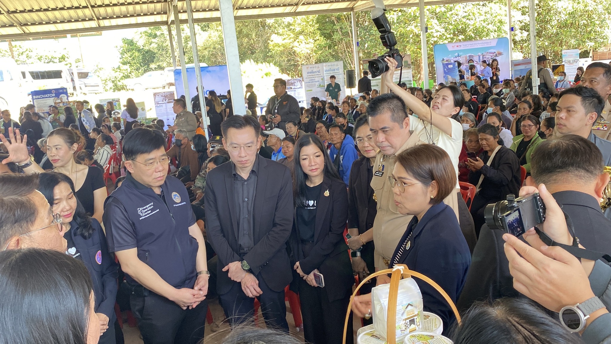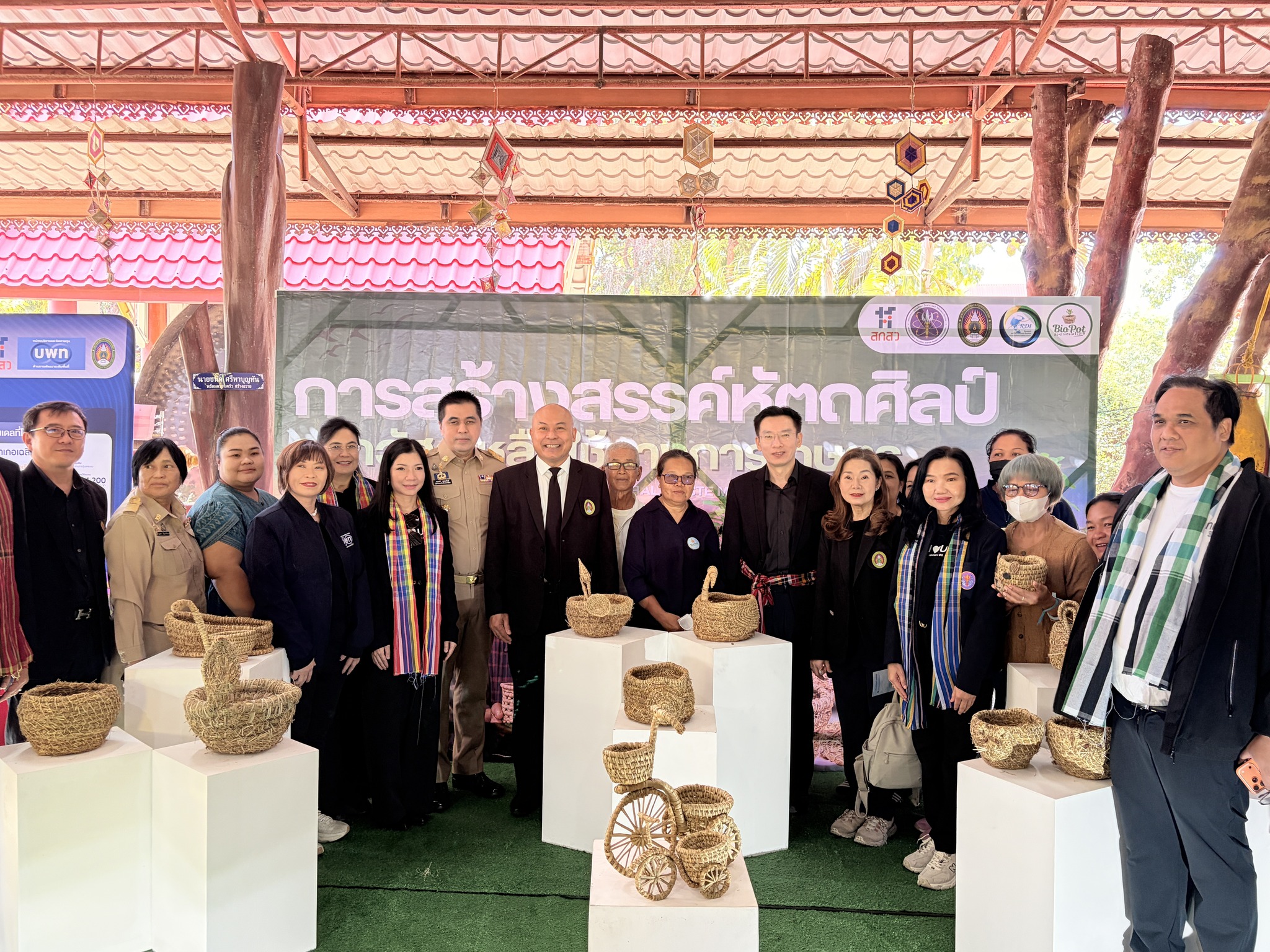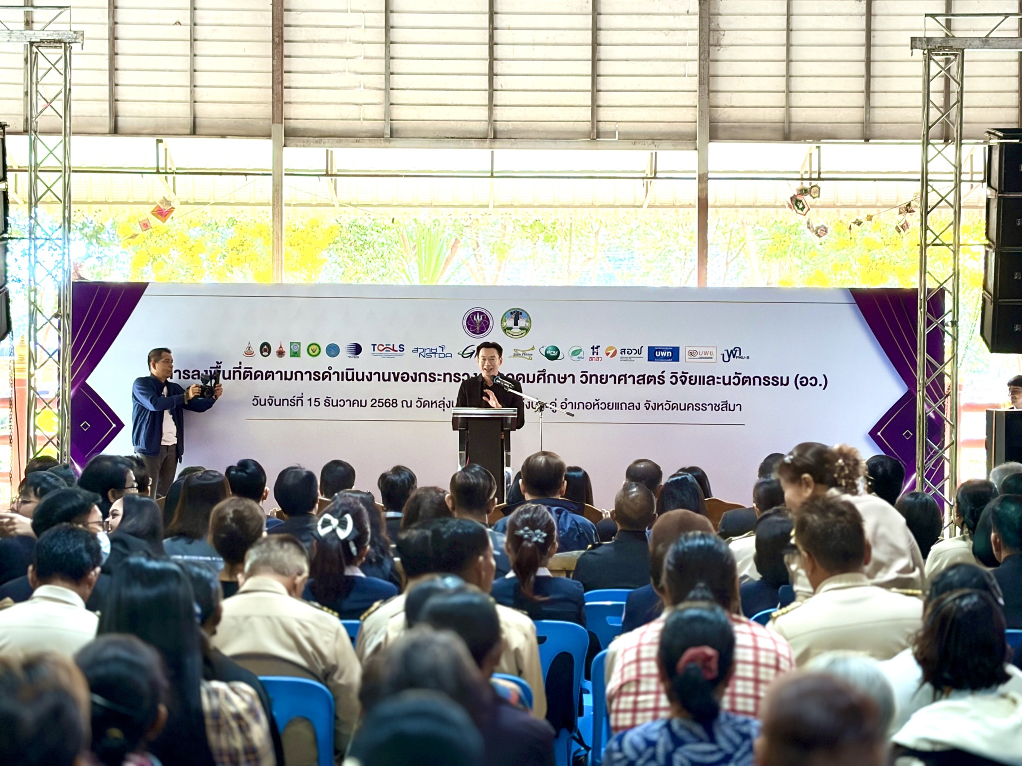 วันที่ 15 ธันวาคม 2568 มหาวิทยาลัยราชภัฏนครราชสีมา ให้การต้อนรับการลงพื้นที่ติดตามการดำเนินงานของกระทรวงการอุดมศึกษา วิทยาศาสตร์ วิจัยและนวัตกรรม ( กระทรวง อว.) ณ วัดหลุ่มประดู่ อำเภอห้วยแถลง และ วัดป่าหนองบัวเกาะเพชร อำเภอจักราช จังหวัดนครราชสีมา โดยมี ศาสตราจารย์ ดร.ศุภชัย ปทุมนากุล ปลัดกระทรวง อว. เป็นประธานในการลงพื้นที่ติดตามการดำเนินงาน ในการนี้มี นายอนุพงศ์ สุขสมนิตย์ ผู้ว่าราชการจังหวัดนครราชสีมา กล่าวต้อนรับ พร้อมด้วย คณะกรรมการบริหารมหาวิทยาลัยราชภัฏนครราชสีมาให้การสนันบสนุนการจัดกิจกรรม ในการลงพื้นที่ครั้งนี้ มหาวิทยาลัยราชภัฏนครราชสีมาได้มีการตั้งจุดบริการตรวจสุขภาพให้กับประชาชน ประกอบด้วย การถ่ายทอดองค์ความรู้เรื่องพยาธิใบไม้ในตับ , การตรวจคัดกรองและถ่ายทอดองค์ความรู้มะเร็งเต้านม โดยคณะพยาบาลศาสตร์ พร้อมด้วย การตรวจคัดกรองโรค NCD (เบาหวาน ความดัน) และการตรวจสารเคมีกำจัดศัตรูพืชในร่างกาย โดย คณะสาธารณสุขศาสตร์ และ การบริการซ่อมเครื่องใช้ไฟฟ้าและเปลี่ยนถ่ายน้ำมันเครื่อง รถจักรยานยนต์ โดยคณะเทคโนโลยีอุตสาหกรรม พร้อมกันนี้ยังมีการจัดแสดงนิทรรศการนวัตกรรมการพัฒนาผลิตภัณฑ์ โดยมหาวิทยาลัยราชภัฏนครราชสีมา ได้นำผลงานวิจัยและนวัตกรรมจากกองทุน ววน. : การส่งเสริม Creative Economy ผ่านงานหัตถกรรมท้องถิ่น และการยกระดับสินค้าเกษตร มันสำปะหลังและข้าว และ โครงการพัฒนาและยกระดับแพลตฟอร์มเพื่อการแก้ไขปัญหาความยากจน
