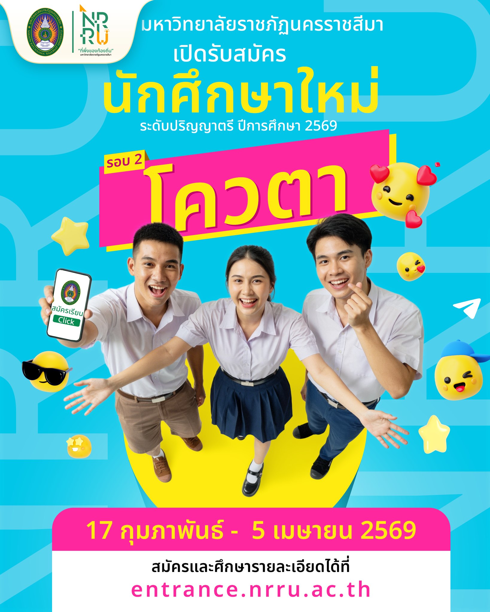 มหาวิทยาลัยราชภัฏนครราชสีมา เปิดรับสมัครนักศึกษาใหม่ "รอบโควตา" ระดับปริญญาตรี ภาคปกติ ปีการศึกษา 2569