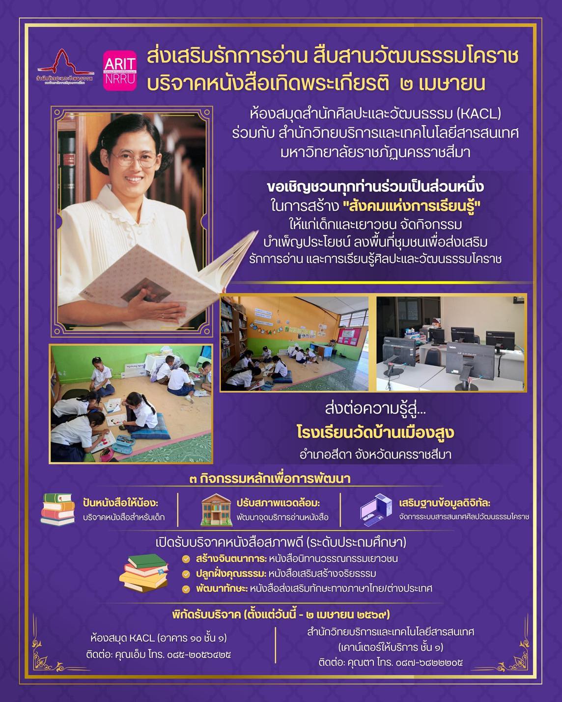 ห้องสมุดสำนักศิลปะและวัฒนธรรม (KACL) ร่วมกับ สำนักวิทยบริการและเทคโนโลยีสารสนเทศ มหาวิทยาลัยราชภัฏนครราชสีมา ขอเชิญชวนทุกท่านร่วมเป็นส่วนหนึ่งในการสร้าง "สังคมแห่งการเรียนรู้" ให้แก่เด็กและเยาวชน จัดกิจกรรมบำเพ็ญประโยชน์ ลงพื้นที่ชุมชนเพื่อส่งเสริมรักการอ่าน และการเรียนรู้ศิลปะและวัฒนธรรมโคราช