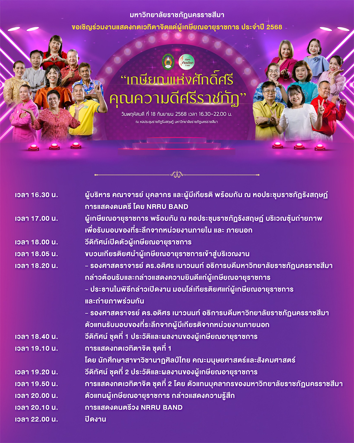 มหาวิทยาลัยราชภัฏนครราชสีมา ขอเชิญทุกท่านร่วมงานแสดงกตเวทิตาจิตแด่ผู้เกษียณอายุราชการ ประจำปี 2568 “เกษียณแห่งศักดิ์ศรี คุณความดีศรีราชภัฏ”