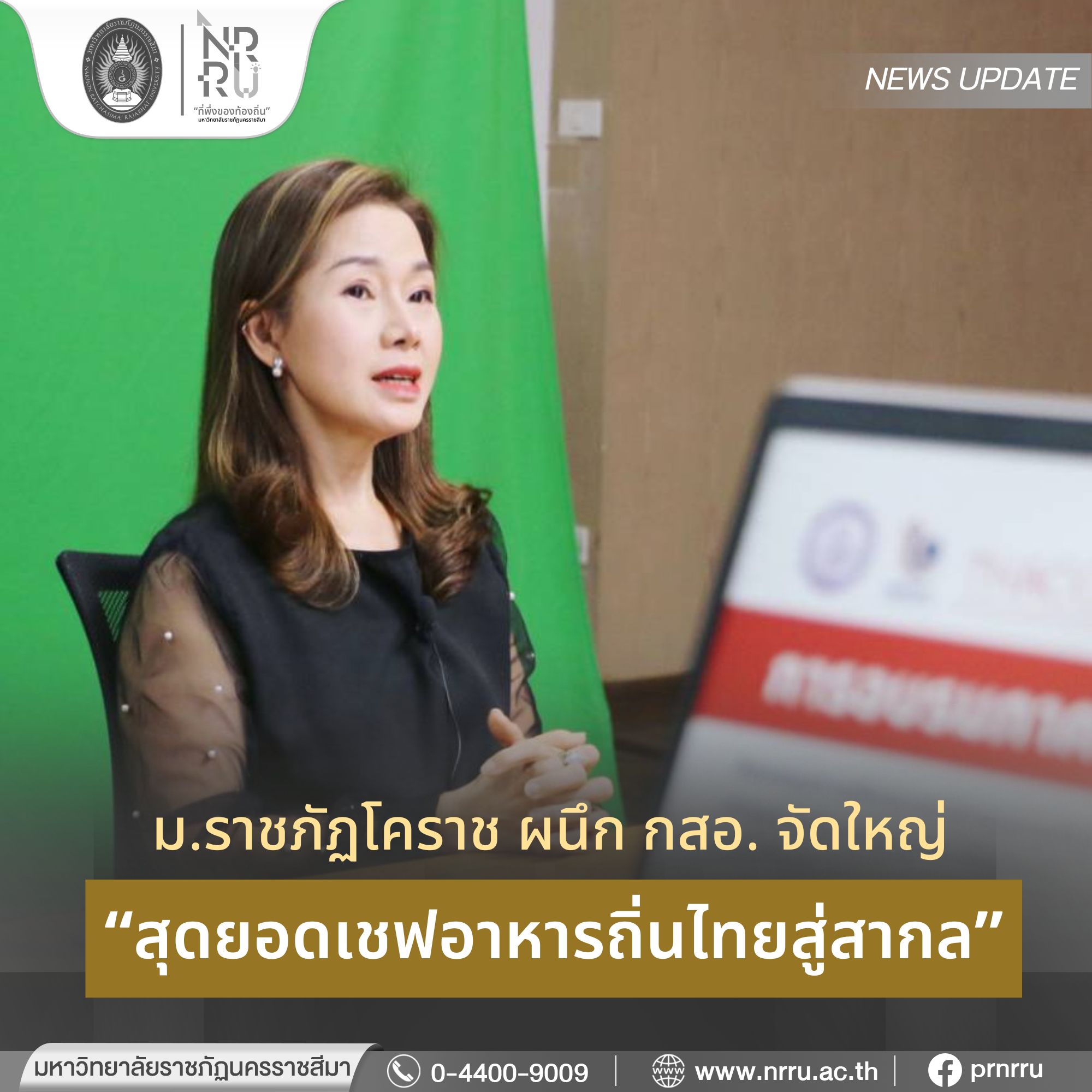 มหาวิทยาลัยราชภัฏนครราชสีมา ร่วมกับ กองพัฒนาอุตสาหกรรมชุมชน กรมส่งเสริมอุตสาหกรรม กระทรวงอุตสาหกรรม และภาคีเครือข่าย จัดกิจกรรมฝึกอบรมเชิงลึกสุดยอดเชฟอาหารถิ่นไทยสู่สากล ตามเกณฑ์มาตราฐานวิชาชีพสากล ภายใต้โครงการยกระดับหนึ่งเชฟหมู่บ้าน หนึ่งเชฟอาหารไทย ปี 2568 ภาคทฤษฎี (ออนไลน์) ระหว่างวันที่ 25 - 26 ตุลาคม 2568 โดยได้รับเกียรติจาก ผู้ช่วยศาสตราจารย์สุธีรา เข็มทอง รองอธิการบดีฝ่ายแผน งบประมาณและพัฒนาคุณภาพ มหาวิทยาลัยราชภัฏนครราชสีมา เป็นประธานเปิดการอบรม จากนั้นเป็นการบรรยายวิชา “เทคโนโลยีการประกอบอาหารระดับโมเลกุล และการประยุกต์ใช้ในการ ประกอบอาหารไทย” วิทยากรโดย ดร.ภัทราพร ยุธาชิต จากมหาวิทยาลัยราชภัฏนครราชสีมา ต่อด้วยการบรรยายวิชา “การพัฒนาตำรับอาหาร และการจัดทำตำรับอาหารมาตรฐาน” วิทยากรโดย อาจารย์ทศพร ลิ้มดำเนิน เชฟผู้เชี่ยวชาญ World Skill Thailand, การบรรยายวิชา “บริบทและแนวโน้มทางการตลาดของธุรกิจอาหารไทย” วิทยากรโดย อาจารย์ธนากร ทั่งเรือง สถาบันเทคโนโลยีพระจอมเกล้าเจ้าคุณทหารลาดกระบัง, การบรรยายวิชา “สุขาภิบาลอาหาร การจัดการเพื่ออาหารปลอดภัย” วิทยากรโดย ดร.จันจนา ศิริพันธ์วัฒนา มหาวิทยาลัยสวนดุสิต และการบรรยายวิชา “การวานแผนการปฏิบัติงานสำหรับงานครัว และการบริหาร ทรัพยากรงานครัว” วิทยากรโดย อาจารย์ชิษณุพงศ์ ธนพิบูลพงศ์ มหาวิทยาลัยราชภัฏนครราชสีมา นอกจากนี้ ยังได้จัดอบรมภาคปฏิบัติโดยได้รับความร่วมมือจากภาคีเครือข่ายจัดอบรมในภูมิภาคต่าง ๆ อีกด้วย