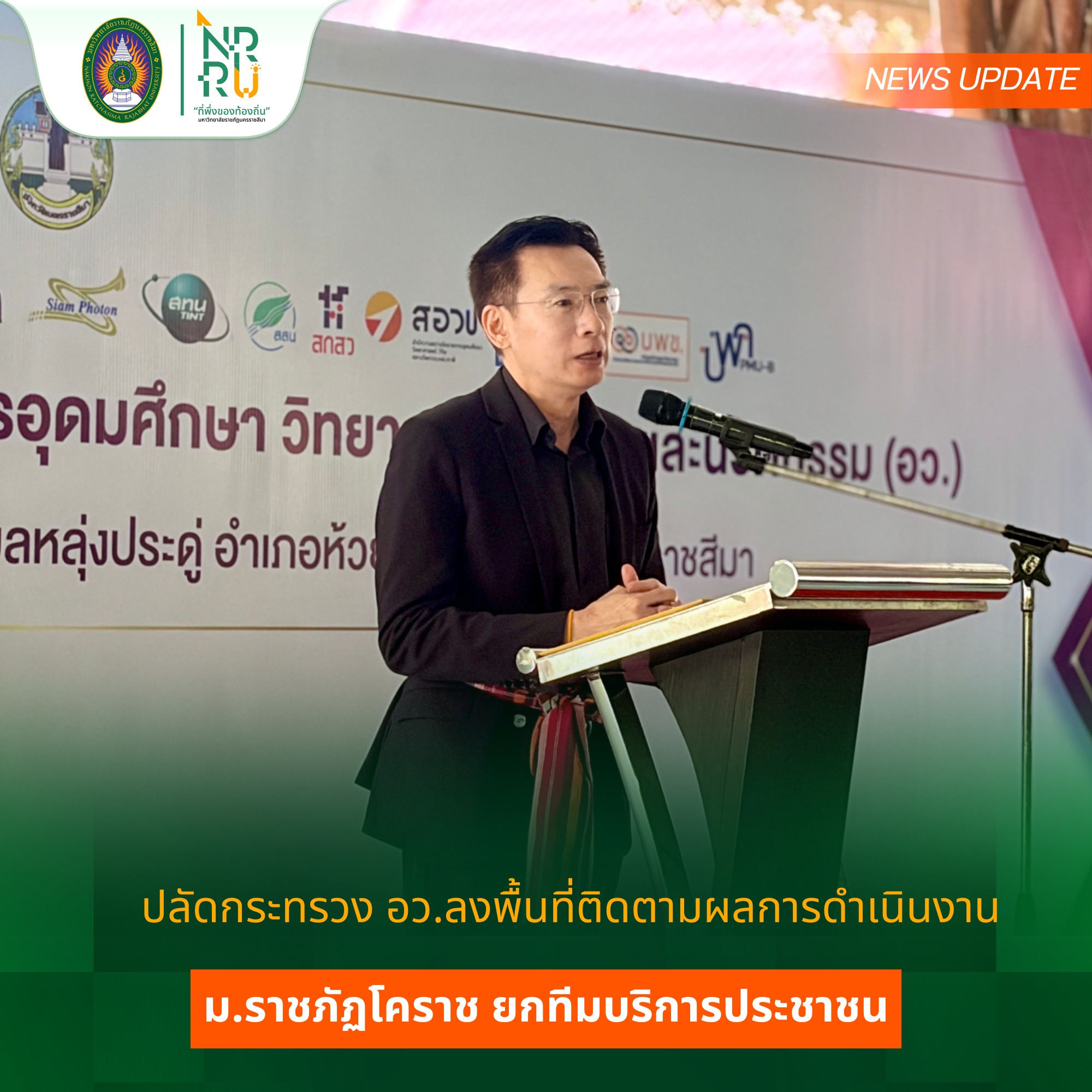 วันที่ 15 ธันวาคม 2568 มหาวิทยาลัยราชภัฏนครราชสีมา ให้การต้อนรับการลงพื้นที่ติดตามการดำเนินงานของกระทรวงการอุดมศึกษา วิทยาศาสตร์ วิจัยและนวัตกรรม ( กระทรวง อว.) ณ วัดหลุ่มประดู่ อำเภอห้วยแถลง และ วัดป่าหนองบัวเกาะเพชร อำเภอจักราช จังหวัดนครราชสีมา โดยมี ศาสตราจารย์ ดร.ศุภชัย ปทุมนากุล ปลัดกระทรวง อว. เป็นประธานในการลงพื้นที่ติดตามการดำเนินงาน ในการนี้มี นายอนุพงศ์ สุขสมนิตย์ ผู้ว่าราชการจังหวัดนครราชสีมา กล่าวต้อนรับ พร้อมด้วย คณะกรรมการบริหารมหาวิทยาลัยราชภัฏนครราชสีมาให้การสนันบสนุนการจัดกิจกรรม ในการลงพื้นที่ครั้งนี้ มหาวิทยาลัยราชภัฏนครราชสีมาได้มีการตั้งจุดบริการตรวจสุขภาพให้กับประชาชน ประกอบด้วย การถ่ายทอดองค์ความรู้เรื่องพยาธิใบไม้ในตับ , การตรวจคัดกรองและถ่ายทอดองค์ความรู้มะเร็งเต้านม โดยคณะพยาบาลศาสตร์ พร้อมด้วย การตรวจคัดกรองโรค NCD (เบาหวาน ความดัน) และการตรวจสารเคมีกำจัดศัตรูพืชในร่างกาย โดย คณะสาธารณสุขศาสตร์ และ การบริการซ่อมเครื่องใช้ไฟฟ้าและเปลี่ยนถ่ายน้ำมันเครื่อง รถจักรยานยนต์ โดยคณะเทคโนโลยีอุตสาหกรรม พร้อมกันนี้ยังมีการจัดแสดงนิทรรศการนวัตกรรมการพัฒนาผลิตภัณฑ์ โดยมหาวิทยาลัยราชภัฏนครราชสีมา ได้นำผลงานวิจัยและนวัตกรรมจากกองทุน ววน. : การส่งเสริม Creative Economy ผ่านงานหัตถกรรมท้องถิ่น และการยกระดับสินค้าเกษตร มันสำปะหลังและข้าว และ โครงการพัฒนาและยกระดับแพลตฟอร์มเพื่อการแก้ไขปัญหาความยากจน