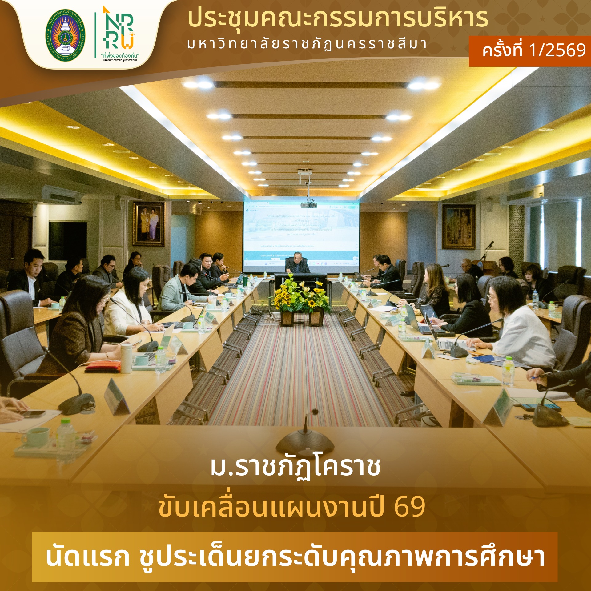 วันนี้ (27 มกราคม 2569) ณ ห้องประชุม ดร.เศาวนิต เศาณานนท์ มหาวิทยาลัยราชภัฏนครราชสีมา ได้จัดการประชุมคณะกรรมการบริหารมหาวิทยาลัย (กบ.) ครั้งที่ 1/2569 โดยมี รองศาสตราจารย์ ดร.อดิศร เนาวนนท์ อธิการบดี เป็นประธานในการประชุม พร้อมด้วยคณะผู้บริหาร คณบดี และผู้อำนวยการสำนัก/สถาบัน เข้าร่วมอย่างพร้อมเพรียงเพื่อวางแนวทางดำเนินงานในปีงบประมาณใหม่ โดยมีวาระสำคัญได้แก่
