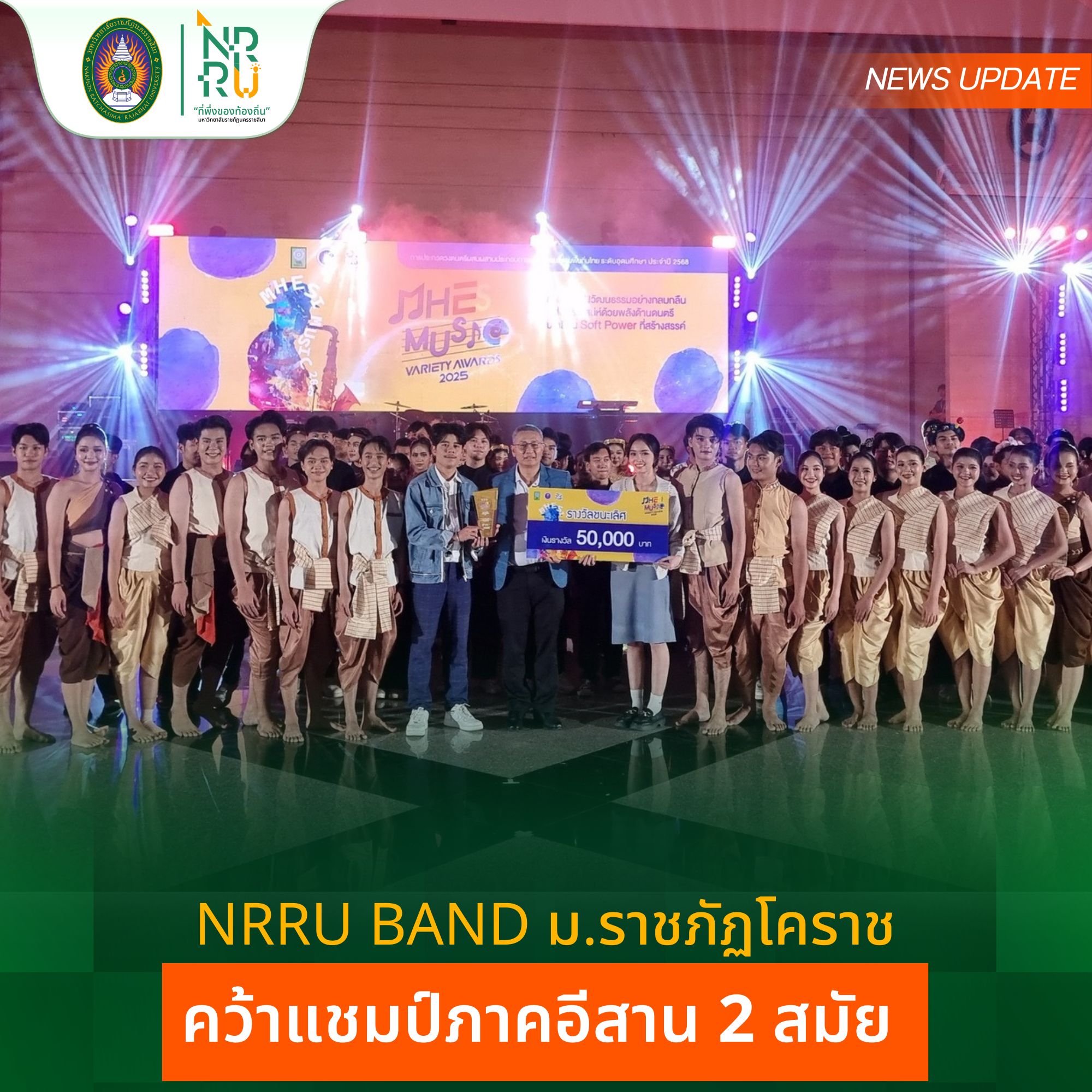 มหาวิทยาลัยราชภัฏนครราชสีมา ขอแสดงความยินดีกับ วง NRRU BAND มหาวิทยาลัยราชภัฏนครราชสีมา ในโอกาสคว้ารางวัลชนะเลิศ ของภาคตะวันออกเฉียงเหนือ เป็นตัวแทนเข้าสู่การประกวดรอบประเทศ ในการประกวดวงดนตรีผสมผสานประกอบการแสดงวัฒนธรรมพื้นถิ่นไทย ระดับอุดมศึกษา รอบภาคตะวันออกเฉียงเหนือ MHESI MUSIC VARIETY AWARDS 2025 ภายใต้งานมหกรรมส่งเสริมการใช้ประโยชน์ อววน. เพื่อการพัฒนาเศรษฐกิจไทยอย่างยั่งยืนด้วยพลังสหวิทยาการ (อว.แฟร์ : Sci Power For Future Thailand) การประกวดรอบภาคตะวันออกเฉียงเหนือ ณ หอประชุมมหาวิทยาลัยราชภัฏอุดรธานี จังหวัดอุดรธานี เมื่อวันที่ 17 กรกฎาคม 2568 จัดโดย กระทรวงการอุดมศึกษา วิทยาศาสตร์ วิจัยและนวัตกรรม โดยวง NRRU BAND มหาวิทยาลัยราชภัฏนครราชสีมา รับเงินรางวัลจำนวน 50,000 บาท และเป็นตัวแทนภาคตะวันออกเฉียงเหนือ เข้าสู่การประกวดรอบประเทศ ในวันที่ 16 สิงหาคม 2568 ณ ศูนย์ประชุมแห่งชาติสิริกิติ์ กรุงเทพมหานคร