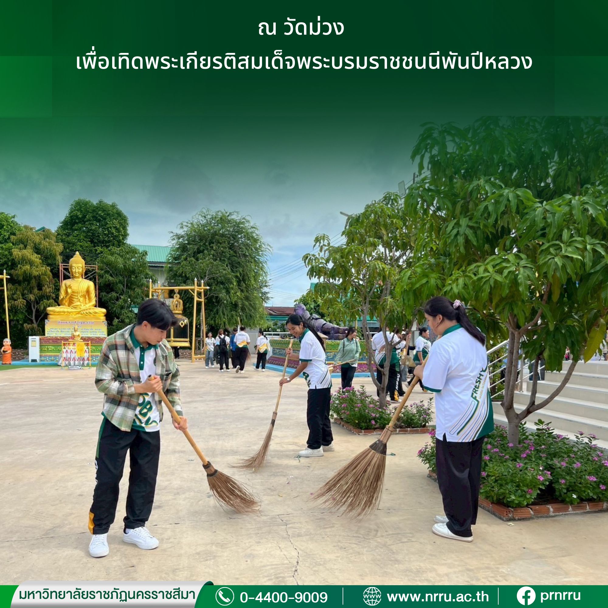 เมื่อวันที่ 24 สิงหาคม 2568 กองพัฒนานักศึกษา มหาวิทยาลัยราชภัฏนครราชสีมา จัดโครงการจิตอาสา “เราทำความดี ด้วยหัวใจ” เฉลิมพระเกียรติสมเด็จพระนางเจ้าสิริกิติ์ พระบรมราชินีนาถ พระบรมราชชนนีพันปีหลวง เนื่องในโอกาสมหามงคลวันเฉลิมพระชนมพรรษา 12 สิงหาคม ณ วัดม่วง ตำบลในเมือง อำเภอเมือง จังหวัดนครราชสีมา โดยมี ผู้ช่วยศาสตราจารย์ ดร.ณัฐกิตติ์ อินทร์สวรรค์ รองอธิการบดีฝ่ายพัฒนานักศึกษา เป็นประธานในพิธีเปิด เพื่อเฉลิมพระเกียรติ สมเด็จพระนางเจ้าสิริกิติ์ฯ พร้อมทั้งส่งเสริมพัฒนาและปลูกฝังจิตสำนึกสาธารณะแก่นักศึกษาให้รู้จักการเสียสละร่วมมือร่วมใจในการทำประโยชน์เพื่อส่วนรวม พร้อมที่จะช่วยเหลือผู้อื่นโดยไม่หวังผลตอบแทน ซึ่งจะก่อให้เกิดความรักความสามัคคี และการมีส่วนร่วมของคนในชุมชน
