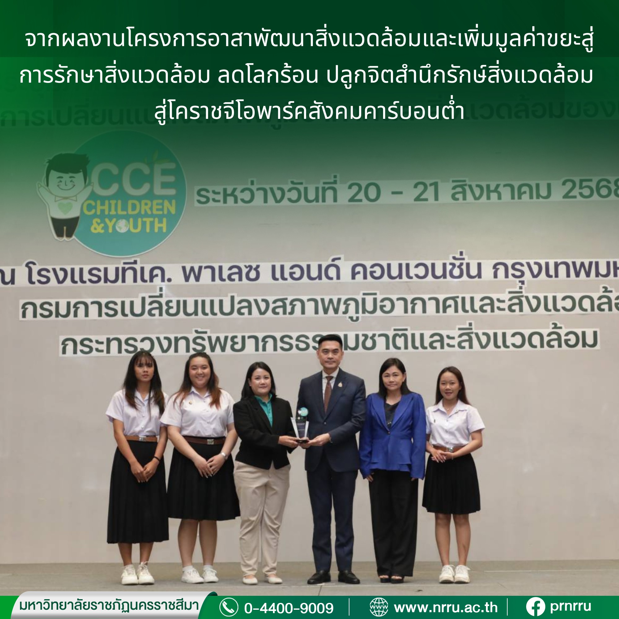 เมื่อวันที่ 20 สิงหาคม 2568 ที่ผ่านมา ผู้ช่วยศาสตราจารย์ ดร.วราภรณ์ โกศัลวิตร และนักศึกษาชมรมสิ่งแวดล้อม ได้แก่ นางสาวทิชานันท์ วรรณทอง, นางสาวกนกภรณ์ กะเช่ารัมย์, และนางสาวฐาปนิตตา จันทร์สว่าง ตัวแทนนักศึกษาชมรมสิ่งแวดล้อม ได้เข้าร่วมในพิธีมอบรางวัล โดยมี ดร.ปาริชาต กรวยนอก ผู้ช่วยผู้อำนวยการสถาบันไม้กลายเป็นหิน ตัวแทนผู้บริหาร ให้เกียรติชมรมสิ่งแวดล้อมเข้าร่วมรับรางวัลการประเมินโครงการด้านการเปลี่ยนแปลงสภาพภูมิอากาศและสิ่งแวดล้อม ประจำปี 2568 จาก ดร.พิรุณ สัยยะสิทธิ์พานิช อธิบดีกรมกรมการเปลี่ยนแปลงสภาพภูมิอากาศและสิ่งแวดล้อม กระทรวงทรัพยากรธรรมชาติและสิ่งแวดล้อม ซึ่งทางชมรมได้ดำเนิน “โครงการอาสาพัฒนาสิ่งแวดล้อมและเพิ่มมูลค่าขยะสู่การรักษาสิ่งแวดล้อม ลดโลกร้อน ปลูกจิตสำนึกรักษ์สิ่งแวดล้อม สู่ โคราชจีโอพาร์คสังคมคาร์บอนต่ำ” ได้รับรางวัลระดับเหรียญเงิน โดยวัตถุประสงค์โครงการสามารถประเมินได้ดังนี้ 1) โครงการสามารถเพิ่มมูลค่าขยะเปลี่ยนขยะให้กลายเป็นทรัพยากรที่มีมูลค่า 2) โครงการสามารถสร้างเศรษฐกิจหมุนเวียน ช่วยลดการปล่อยก๊าซเรือนกระจก ลดโลกร้อน นำของเสียกลับมาใช้ใหม่ 3) โครงการได้ปลูกจิตสำนึกรักษ์สิ่งแวดล้อม สร้างความตระหนักให้กับเยาวชนและชุมชน 4) โครงการได้เสริมสร้างความรู้ให้แก่ นักศึกษา นักเรียนและชุมชน ได้มีส่วนร่วมในการจัดทำกิจกรรมสังคมคาร์บอนต่ำ และ 5) โครงการได้เป็นส่วนหนึ่งของการเสริมสร้างมหาวิทยาลัยเป็นมหาวิทยาลัยสีเขียว