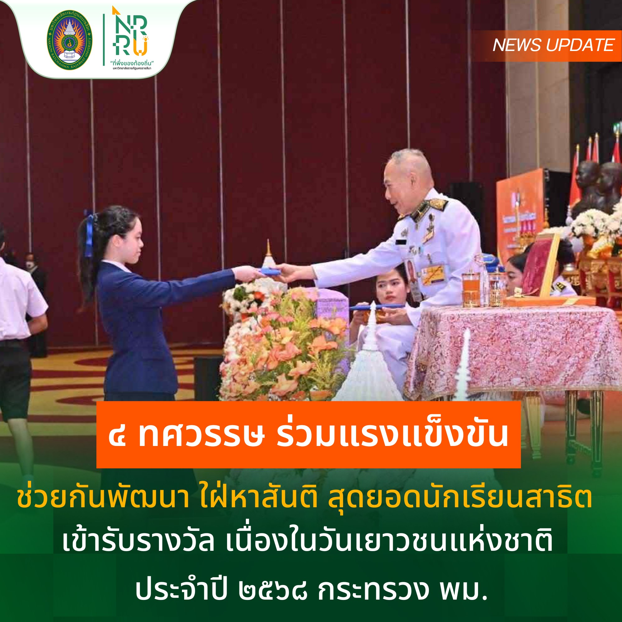 วันเสาร์ที่ ๒๐ กันยายน ๒๕๖๘ เวลา ๑๓.๐๐ น. พระบาทสมเด็จพระเจ้าอยู่หัว ทรงพระกรุณาโปรดเกล้าโปรดกระหม่อมให้ นายอำพน กิตติอำพน องคมนตรี ผู้แทนพระองค์พระบาทสมเด็จพระเจ้าอยู่หัว เป็นประธานในพิธีเปิดงานวันเยาวชนแห่งชาติ ประจำปี ๒๕๖๘ พร้อมมอบเกียรติบัตรและโล่เกียรติยศแก่เด็กและเยาวชนดีเด่นแห่งชาติ และผู้ทำคุณประโยชน์ต่อเด็กและเยาวชน ประจำปี ๒๕๖๘ จำนวน ๑๔๘ รางวัลจากทั่วประเทศ