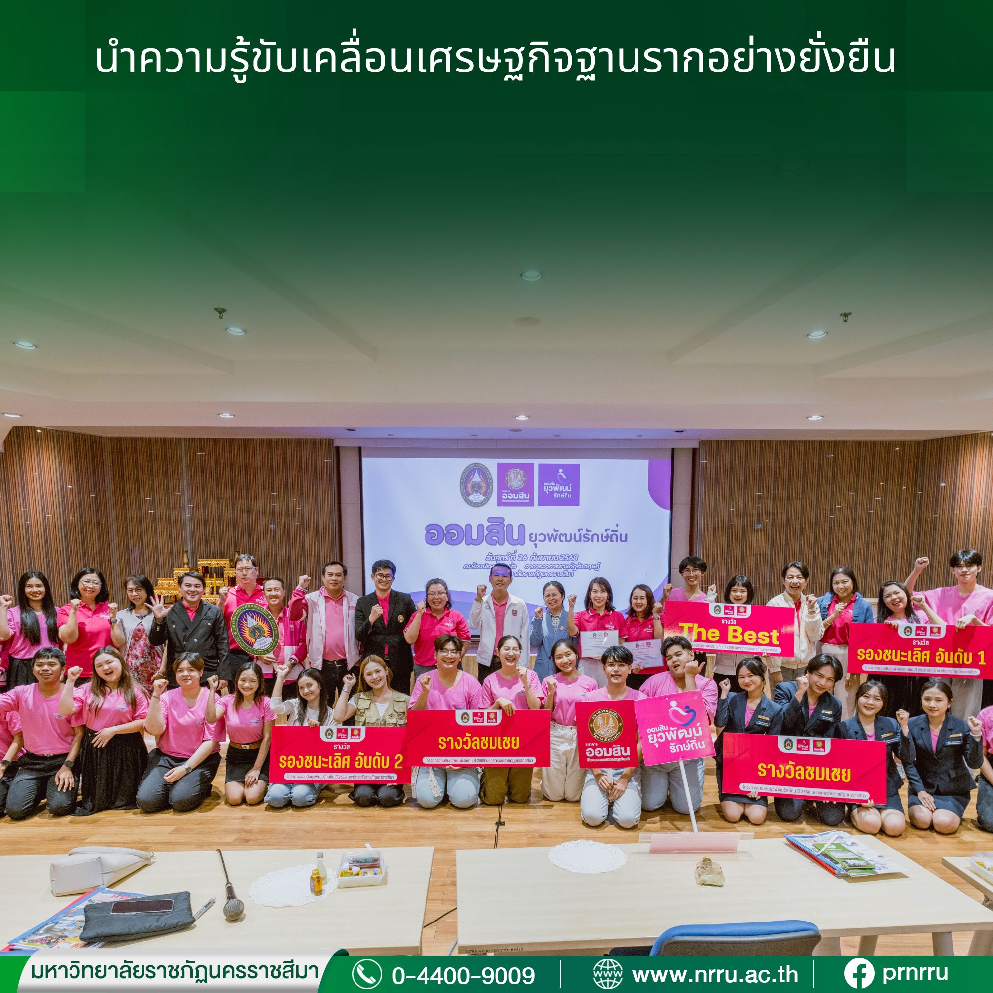 มหาวิทยาลัยราชภัฏนครราชสีมา โดย กองกิจการพิเศษ สำนักงานอธิการบดี ร่วมกับ ธนาคารออมสิน จัดกิจกรรมนำเสนอผลสัมฤทธิ์โครงการออมสินยุวพัฒน์รักษ์ถิ่น ประจำปี 2568 โดยได้รับเกียรติจาก ผศ.ดร.อานรรต ใจสำราญ รองอธิการบดีฝ่ายกิจการสภามหาวิทยาลัย กิจการพิเศษและวิเทศสัมพันธ์ เป็นประธานเปิดโครงการ พร้อมด้วย ดร.อภิรดี เนติรังษีวัชรา ผู้อำนวยการกองกิจการพิเศษ กล่าวรายงาน โดยมี นายธนวัฒน์ ขันธวิจิตร์ ผู้ช่วยผู้อำนวยการฝ่ายพัฒนาธุรกิจผู้ประกอบการรายย่อยและองค์กรชุมชน หน่วยพัฒนาลูกค้าองค์กรชุมชน 1 ธนาคารออมสิน สำนักงานใหญ่ ให้ข้อมูลและแนวทางการดำเนินงาน หลังจากนั้นเป็นการนำเสนอผลสัมฤทธิ์โครงการของนักศึกษา จำนวน 5 ทีม การให้ข้อเสนอแนะของกรรมการ และการประกาศรางวัล ดังนี้
