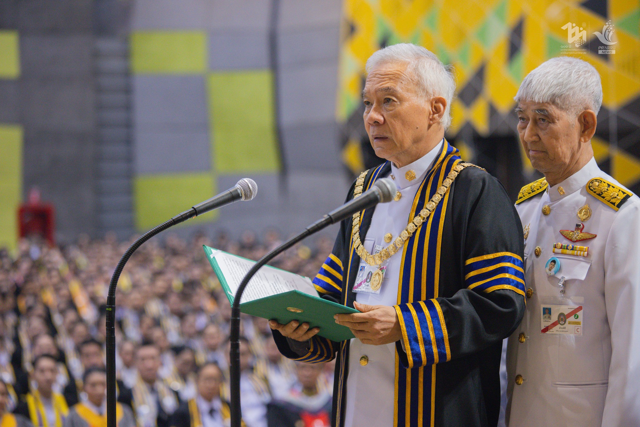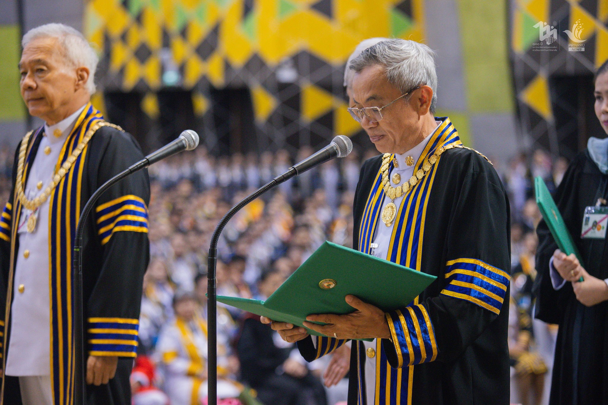 ในการนี้ นายสุวัจน์ ลิปตพัลลภ นายกสภามหาวิทยาลัยราชภัฏนครราชสีมา ได้กล่าวรายงานผลการดำเนินงานมหาวิทยาลัยราชภัฏนครราชสีมา ที่ได้น้อมนำพระบรมราโชบายด้านการศึกษา เพื่อสร้างคุณลักษณะ 4 ประการให้กับผู้เรียน ด้วยสำนึกในพระมหากรุณาธิคุณของพระบาทสมเด็จพระเจ้าอยู่หัว จึงได้น้อมนำแนวทางการดำเนินงาน สู่การปฏิบัติและมีการพัฒนาอย่างต่อเนื่อง โดยในปีงบประมาณ พ.ศ.2568 ได้ขับเคลื่อนงานพัฒนาท้องถิ่นครอบคลุมทั้งมิติเศรษฐกิจ สังคม การศึกษาและสิ่งแวดล้อมมีการสร้างชุมชนต้นแบบด้านการท่องเที่ยว การดูแลสุขภาพ และการบริหารจัดการทรัพยากรธรรมชาติและสิ่งแวดล้อม รวมถึงการพัฒนาต่อยอดอัตลักษณ์ชุมชนสู่ Soft Power จากนั้นเป็นการมอบปริญญาปริญญาดุษฎีบัณฑิตกิตติมศักดิ์ ให้กับผู้ช่วยศาสตราจารย์ ประเทือง จินตสกุล ต่อด้วย รศ.ดร.อดิศร เนาวนนท์ อธิการบดีมหาวิทยาลัยราชภัฏนครราชสีมา กล่าวรายงานผู้สำเร็จการศึกษา จากมหาวิทยาลัยราชภัฏนครราชสีมา รวม 1,623 คน เข้ารับพระราชทานปริญญาบัตร